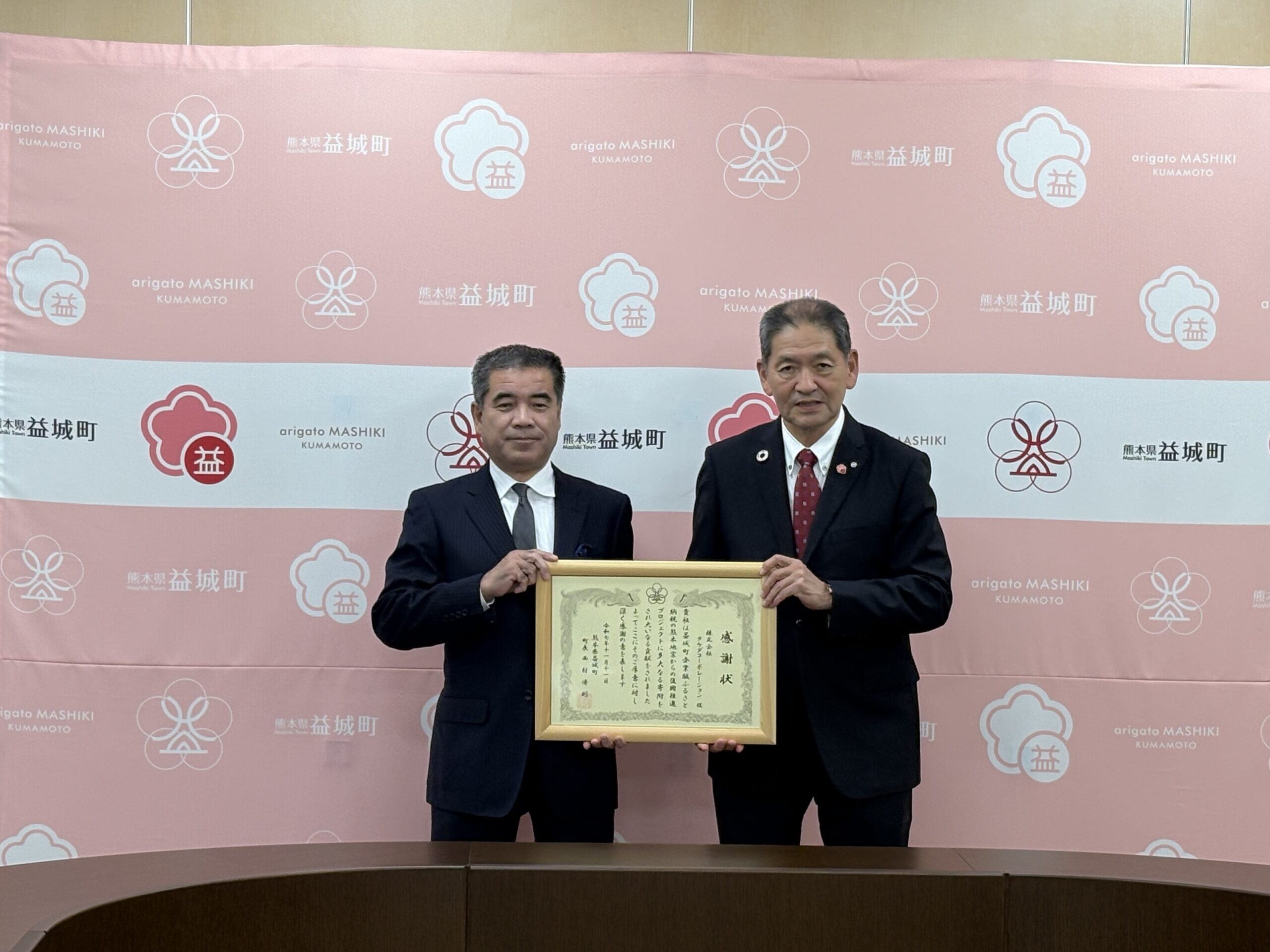 本日(2025年11月11日)、益城町の企業版ふるさと納税目録を贈呈し、西村町長より感謝状を頂きました。